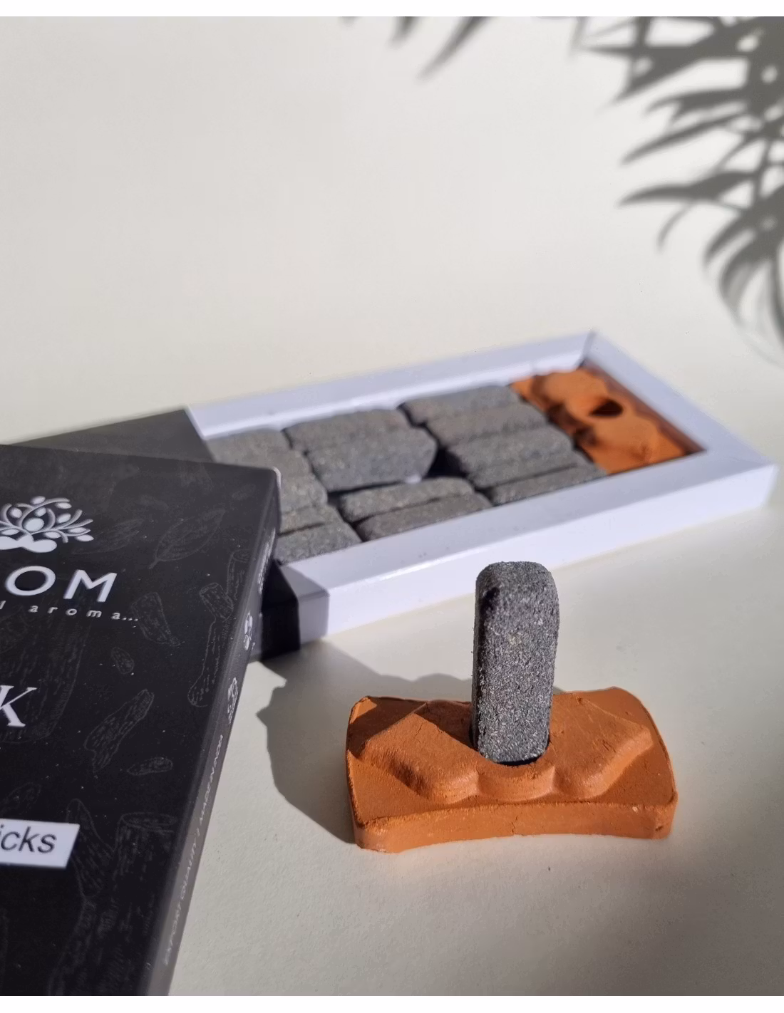 Varje rökelsestav är omsorgsfullt gjord av naturliga ingredienser. Den medföljande terrakottabasen gör bränningen lättare.