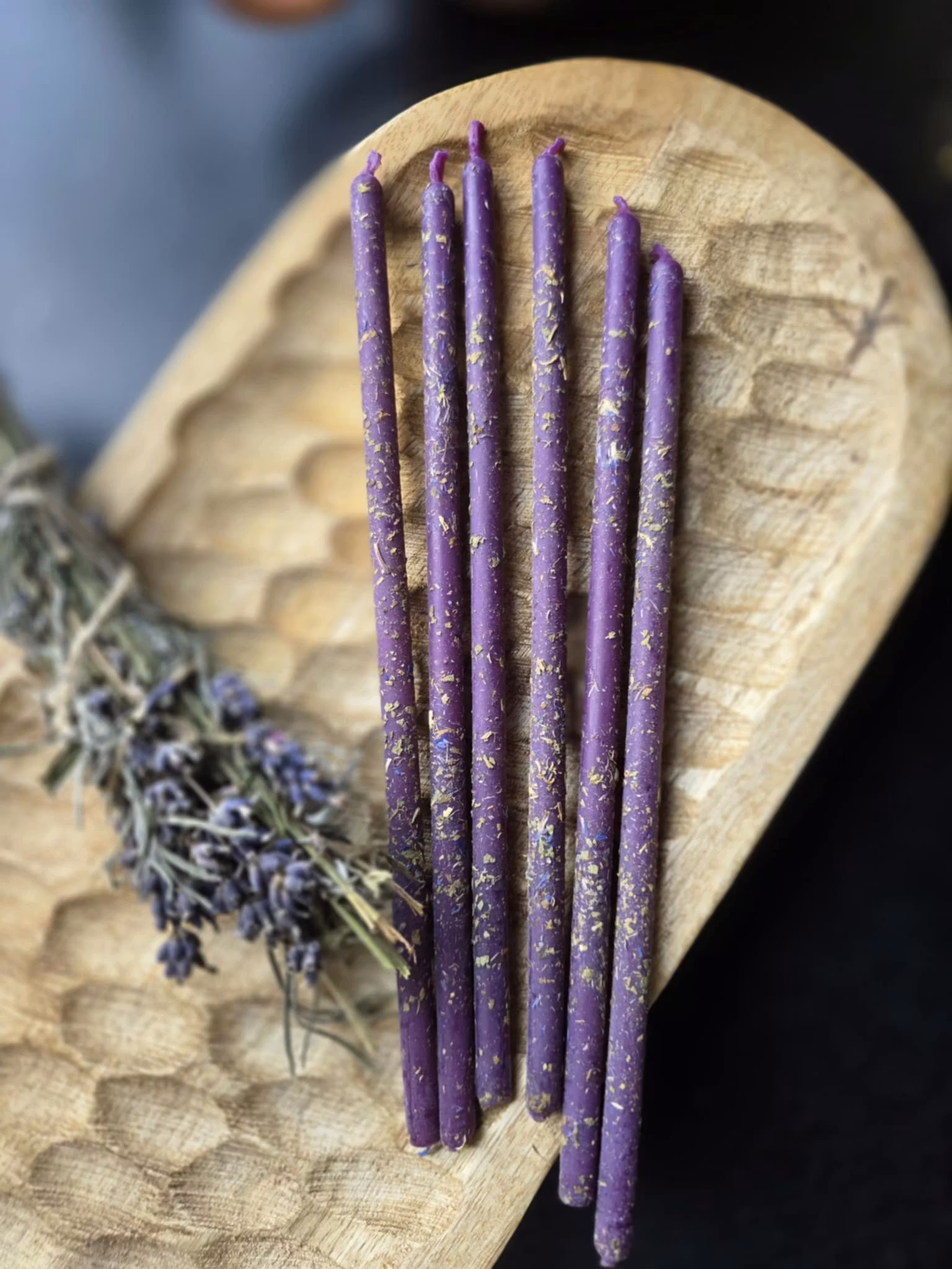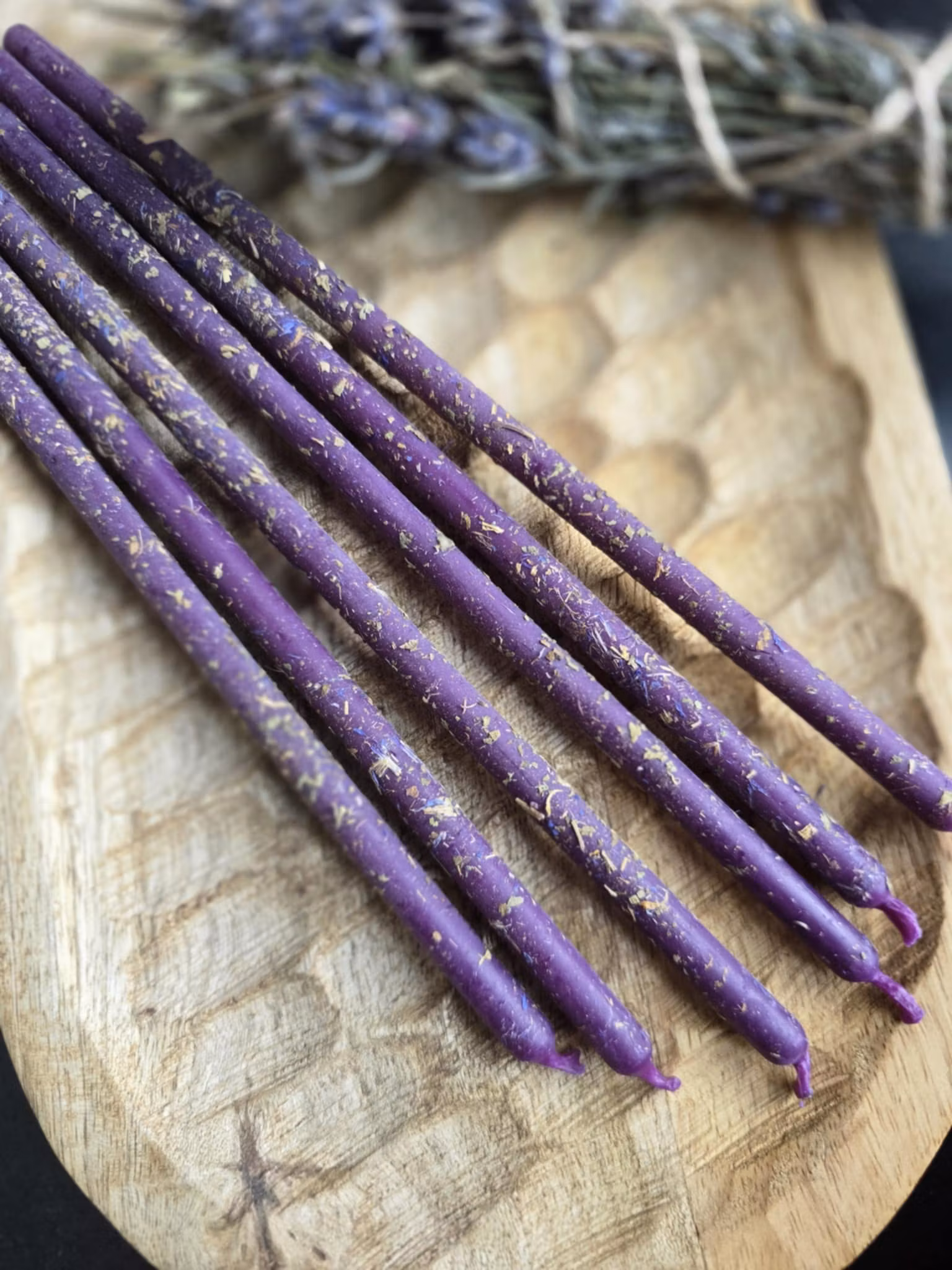 Det lila ljuset med ringblomma, basilika och blåklint är perfekt för ritualer som skapar lugn, positiv energi och en känsla av trygghet.