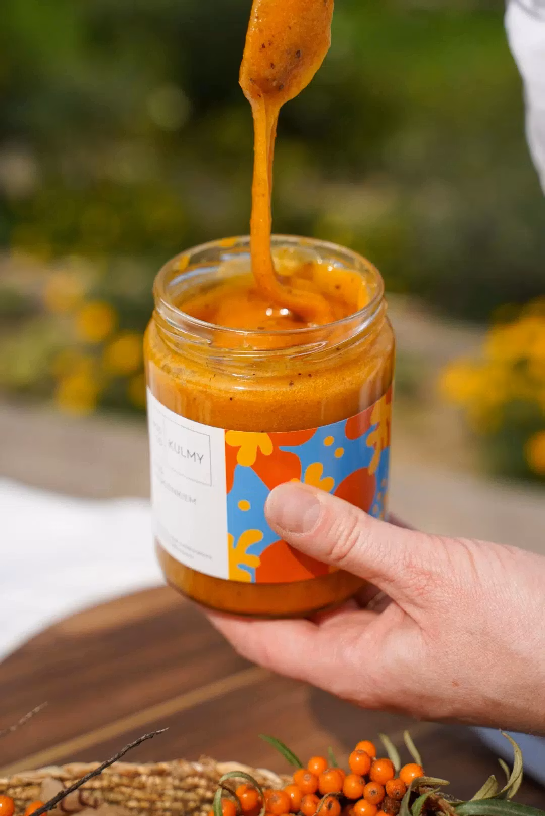 Smak och konsistens För att honungen skulle kombineras väl och jämnt med det frystorkade havtornet krämdes den på låg temperatur. Denna behandling påverkar inte honungens egenskaper utan ändrar dess konsistens till en fluffig kräm. Havtorn gav en otroligt energisk färg och fruktpartiklar som skapar en mycket behaglig textur på tungan. Smaken av multifloral honung är uttrycksfull och intensiv, varför den är en jämställd partner här. Sur havtorn kombineras underbart med den, tillför ännu mer djup och en ton från en helt motsatt skala. Den tillför också en varm, lätt fruktig smak och arom. Honung med havtorn har redan starka fans som äter den direkt från burken. Tack vare sin vackra färg och balans av syrlig och söt smak kommer den att vara ett utmärkt tillskott till desserter.